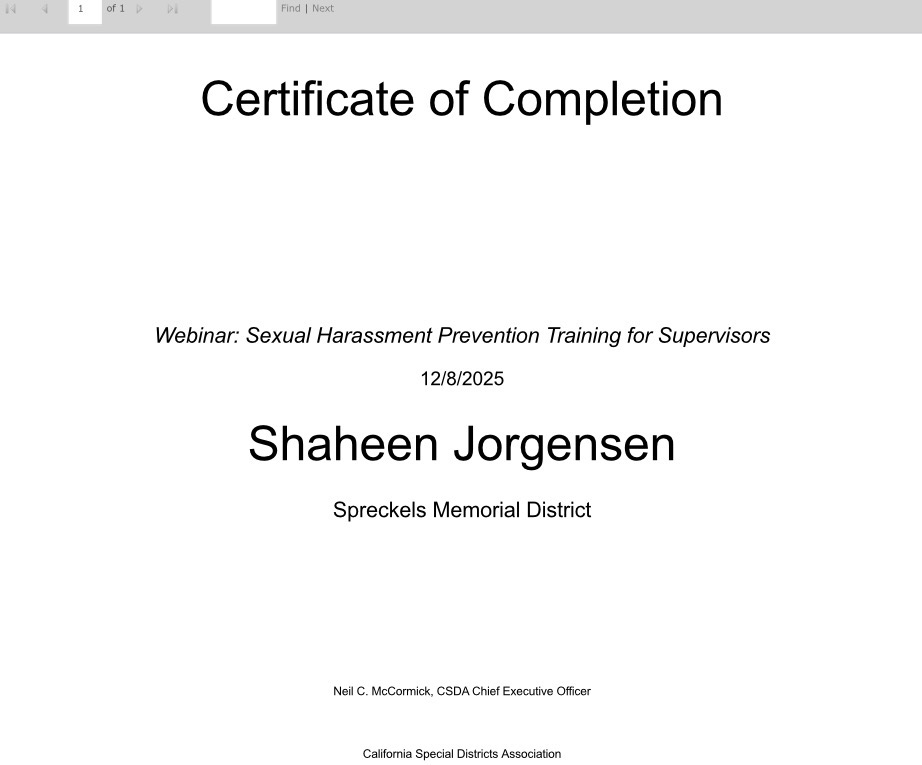Shaheen Jorgensen, Secretary/Board Member Next Election 11/7/2028 SJorgenson - 2025 Ethics AB 1234 Compliance Training Certificate.pdfJorgenson-Sexual Harassment Prevention Training Certificate.jpg